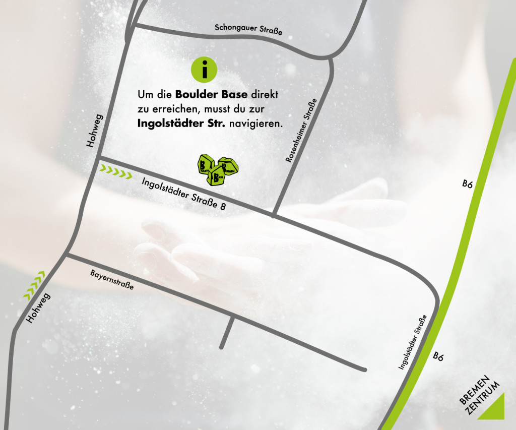 Unsere Boulderhalle hat die Anschrift Hohweg 5 / Eingang Ingolstädter Straße in 28219 Bremen. Anfahrt über die Ingolstädter Straße, ab dem Utbremer Kreisel Richtung „Gewerbegebiet Bayernstraße“ folgen.